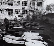 تا شهدا - تصویری که مشاهده می کنید، نمایی است تاریخی از یک مدرسه ی دخترانه . تعدادی از دانش آموزان این مدرسه نیز با پوششی سفید رنگ در حیاط دیده می شوند. حیاطی که از چادر های نیم سوخته سیاه شده است.