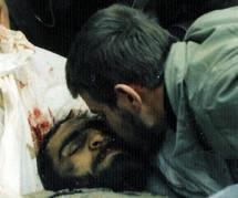 تا شهدا - تصویری که مشاهده می کنید در اسفند ماه سال ۱۳۶۴ گرفته شده است. علی چیت سازیان فرمانده اطلاعات و عملیات لشکر ۳۲ انصارالحسین، برای آخرین وداع با همرزم و معاونش، شهید مصیب مجیدی، پیکر در خون طپیده او را می بوسد.