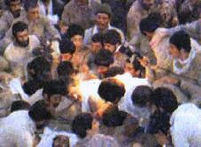 عکسی که می بینید، در اسفند 1365، یک روز پس از شهادت حسین خرازی، در شهرک دارخوین گرفته شده است. بسیجیان ِ لشکر 14 امام حسین(علیه السلام) پیکر کفن پیچیده فرمانده لشکر خود را برای آخرین بار درمیان گرفته و با او خداحافظی می کنند. دیدار به قیامت فرمانده.