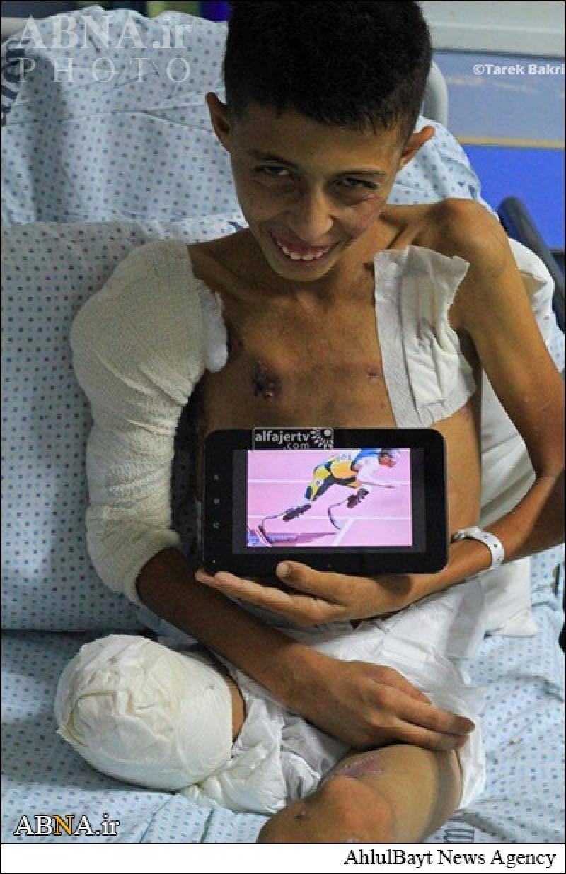 این نوجوان فلسطینی در آخرین حملات جنگندههای رژیم صهیونیستی به نوار تحت محاصره غزه در ماه جولای هر دو پای خود را از دست داد.