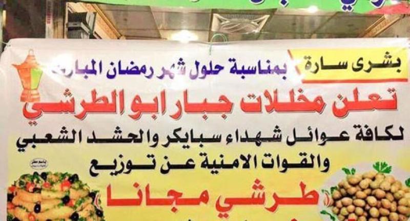 تا شهدا - پلاکارد یک مغازه فروش ترشی در عراق برای عرضه رایگان ترشی در ماه مبارک رمضان به خانوادههای شهدای حشد الشعبی، اسپایکر و…که در نبرد با داعش به شهادت رسیده اند. پلاکارد یک مغازه فروش ترشی در عراق برای عرضه رایگان ترشی در ماه مبارک رمضان به خانوادههای شهدای حشد الشعبی، اسپایکر و…که در نبرد با داعش به شهادت رسیدهاند.