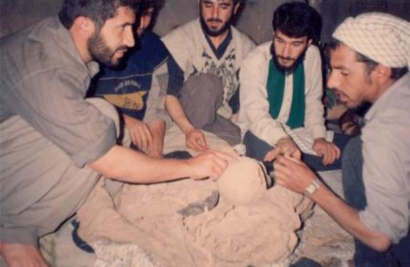 معراج شهدایی در مقر گردان داشتیم که بچه ها جمع شدند و زیارت عاشورا خواندیم. فردای آن روز به کارمان ادامه دادیم. قرار بود از بالای تپه بیل را پایین بیاوریم. من به آقای سلیمانی گفتم: روبه پایین بیا. یک دفعه چشم من به تکه لباسی خورد و شهید تشت زرین را صدا زدم. با سر نیزه شروع به کندن زمین کردیم. در آنجا پیکر دو شهید را یافتیم. بچه ها خوشحال شدند و استخوان های شهدا را می بوسیدند. بین پیکر ها یک قمقه آهنی را برداشتم که پر آب بود. در آن را باز کردم و موقعی که خوردم آنقدر آب در گرمای پنجاه درجه خنک و گوارا بود که انگار همین حالا از یخچال بیرون آوردیم. همه بچه ها دور مرا گرفتند و یک جورعه خوردند. شهید تشت زرین گفت: بچه ها شربت شهادت است بخورید.