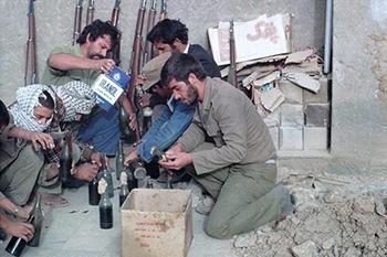 در این تصوبر، جوانان مبارز و انقلابی سال 57 در حال ساخت کوکتل مولوتوف هستند تا با ارتش ستم شاهی مبارزه کنند.