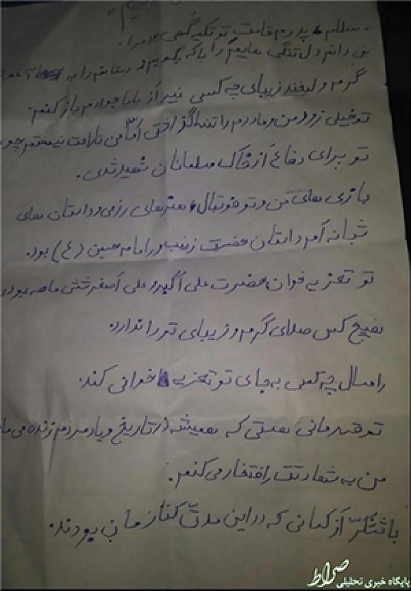 اوج عشق بازی فرزند شهید مدافع حرم در این بند نامه به خوبی مشخص است که تلاش دارد پدر را احساساتی کند، راستی امسال چه کسی به جای تو تعزیه خوانی میکند!
