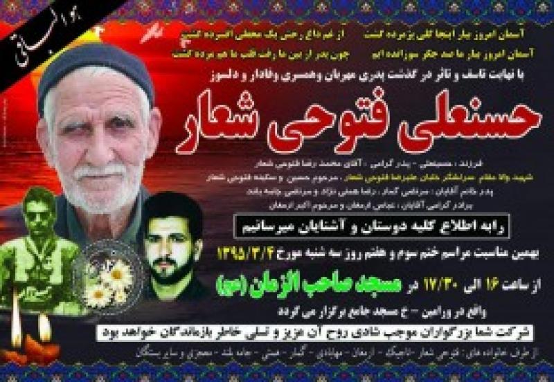 وی گفت: مراسم سوم و هفتم پدر بزرگوار حسنعلی فتوحی شعار روز سه شنبه 4 خرداد از ساعت 16 الی 17:30 در مسجد صاحب الزمان (عج) واقع در ورامین خ مسجد جامع برگزار شد.