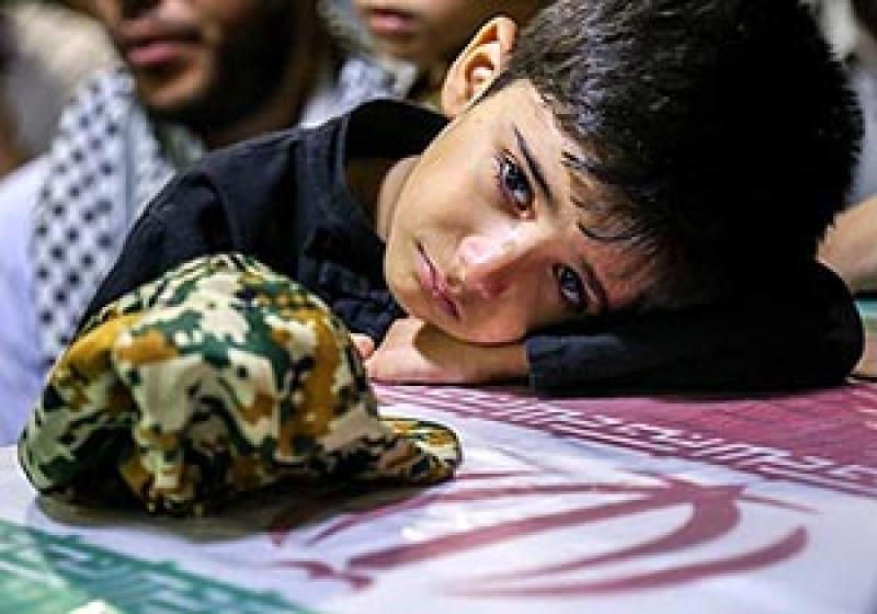 همسر شهید بالای تابوت دستان کوچک فرزندش را که لباس نظامی به تن دارد در دست گرفته و می گوید: «پسرم می خواهد مثل پدرش قهرمان شود.»