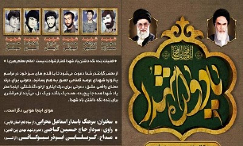 تا شهدا: یادواره شش شهید اطلاعات عملیات شهرستان نی ریز، شامگاه پنجشنبه (ششم تیر) ساعت 21 با سخنرانی سرهنگ پاسدار اسماعیل محرابی و مدیحهسرایی ذاکر اهل بیت (ع) ابوذر بیوکافی در گلزار شهدای این شهرستان برگزار خواهد شد.