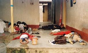 در انتهای کوچه اجساد خانواده ۱۱ نفری به چشم میخورد که روی هم افتاده بودند. بیشترشان زن بودند. گویی در آخرین لحظات به یکدیگر پناه برده و دست هریک پناهگاه دیگری شده بود. تماما سیاه گشته و غیرقابل تشخیص بودند. در کنار این اجساد کودکی سه ساله دیده میشد که از بقیه فاصله داشت. یک دستش را بلند کرده و برای دفاع از خود مقابل صورتش گرفته بود. شاید فطرت پاکش به او آموخته بود که این چنین از خود دفاع کند. در چهرهاش خشمی نقش بسته بود و به آسمان نگاه میکرد، جایی که هواپیماها بمبها را رها میکردند.