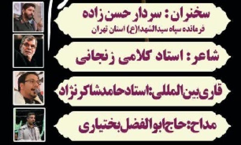 این مراسم با سخنرانی سردار «حسنزاده» فرمانده سپاه سیدالشهدا (ع)، مداحی «ابوالفضل بختیاری»، شعرسرایی «کلامی زنجانی» و با حضور قاری بینالمللی «حامد شاکر نژاد» همراه خواهد بود.